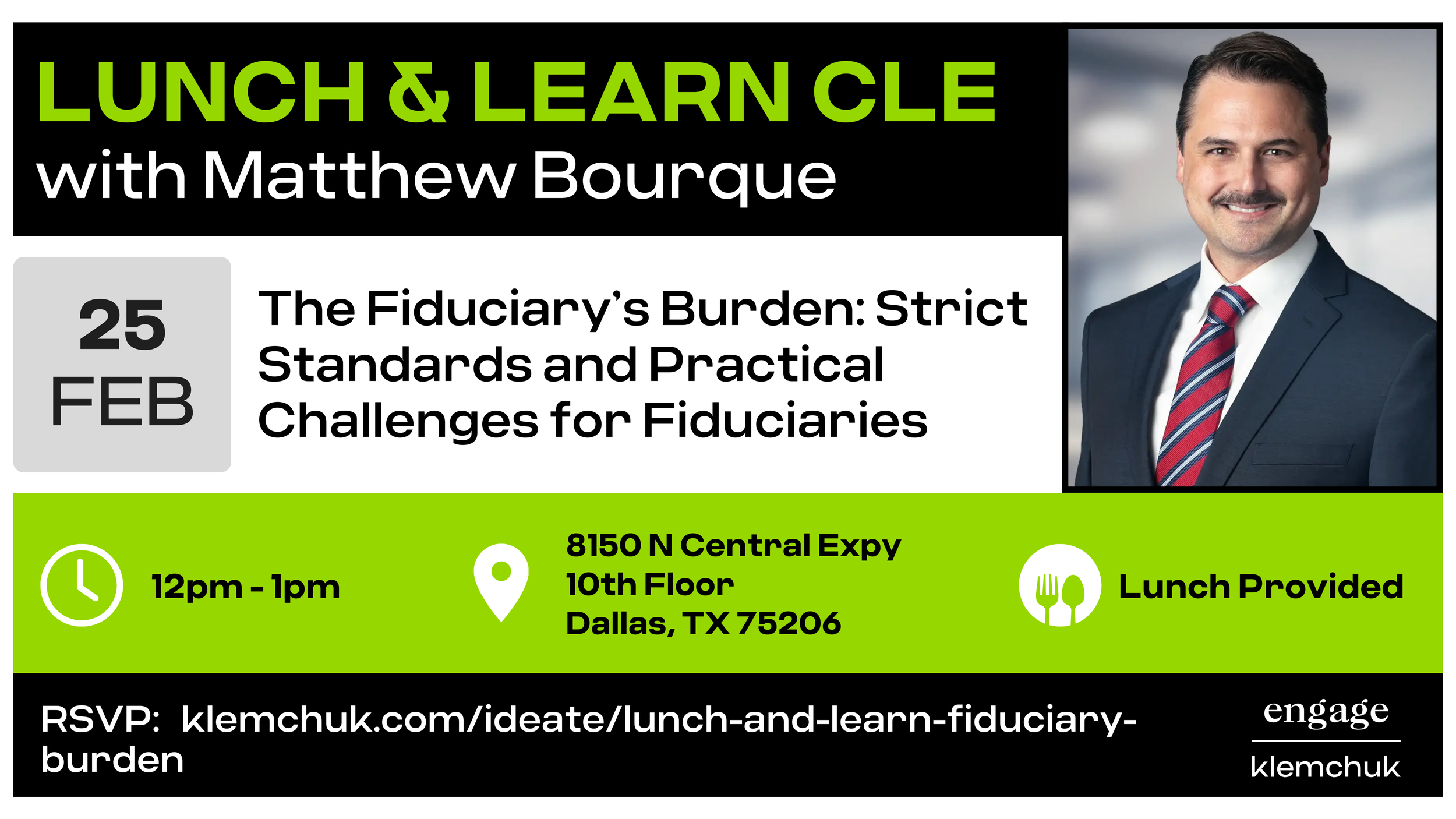 This program examines the fiduciary’s burden through strict legal standards and practical, real-world examples. Attendees will walk through the core fiduciary duties of care, loyalty, full disclosure, and avoiding self-dealing, using familiar scenarios—from continuing family expenses out of habit, to estate property transactions, to disclosure decisions around investments. The discussion highlights how these duties apply in everyday situations and offers practical takeaways for fiduciaries navigating these responsibilities with care and clarity.